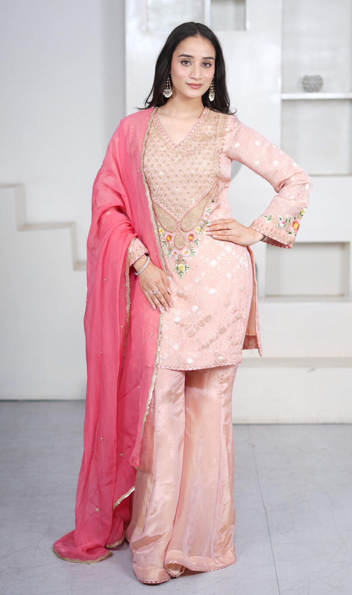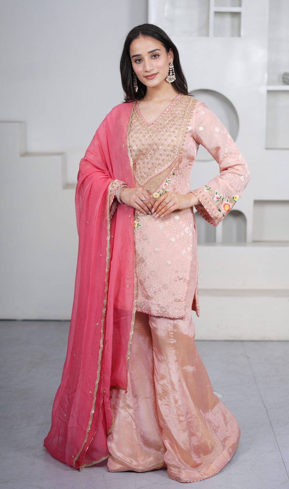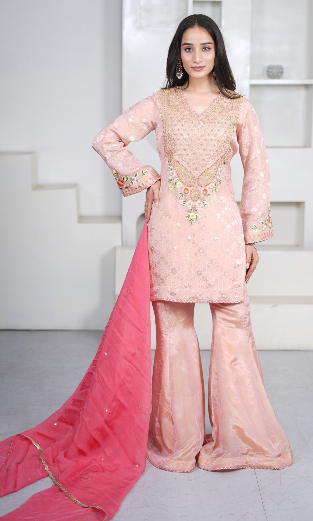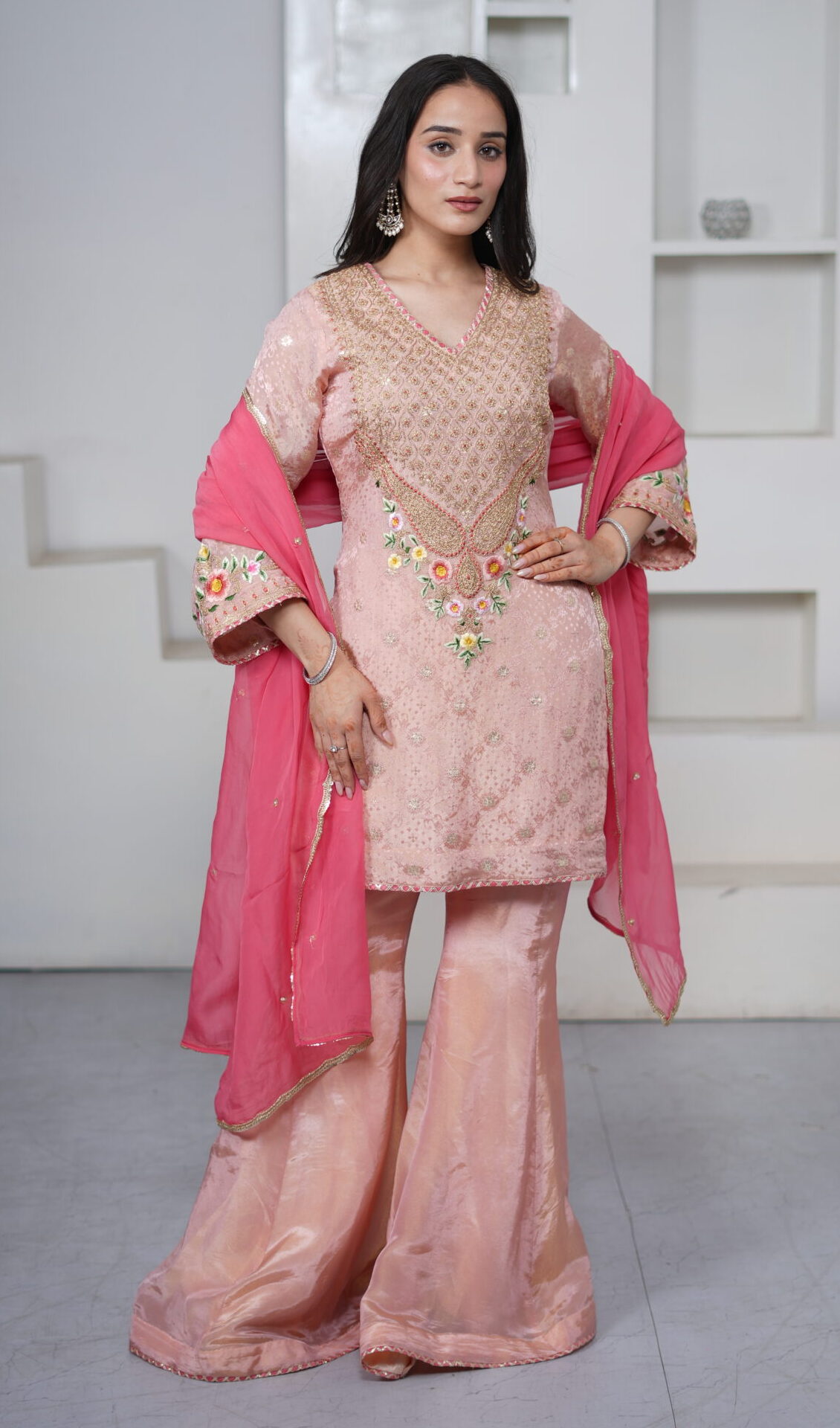 ntroducing our Light Peach Shimmer Silk Short Kurti Set, paired with a flared sharara and an elegant organza dupatta. Crafted in shimmer silk fabric, the kurti features intricate hand dori and resham embroidery, adding a delicate festive charm. The sharara is finished with gota detailing at the hem, while the sheer organza dupatta is adorned with sequin work all over and lace borders, completing the look beautifully for festive gatherings and celebrations.