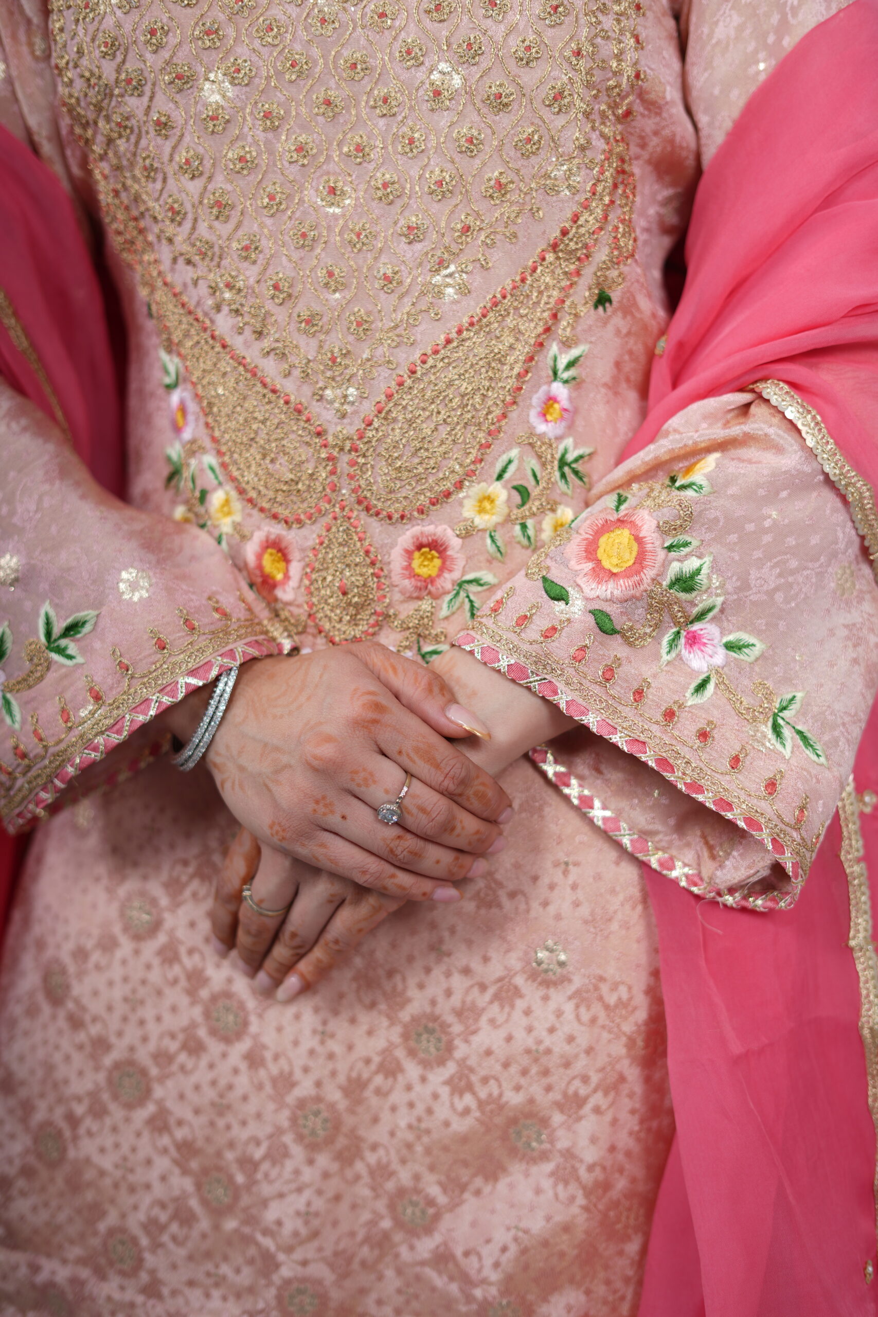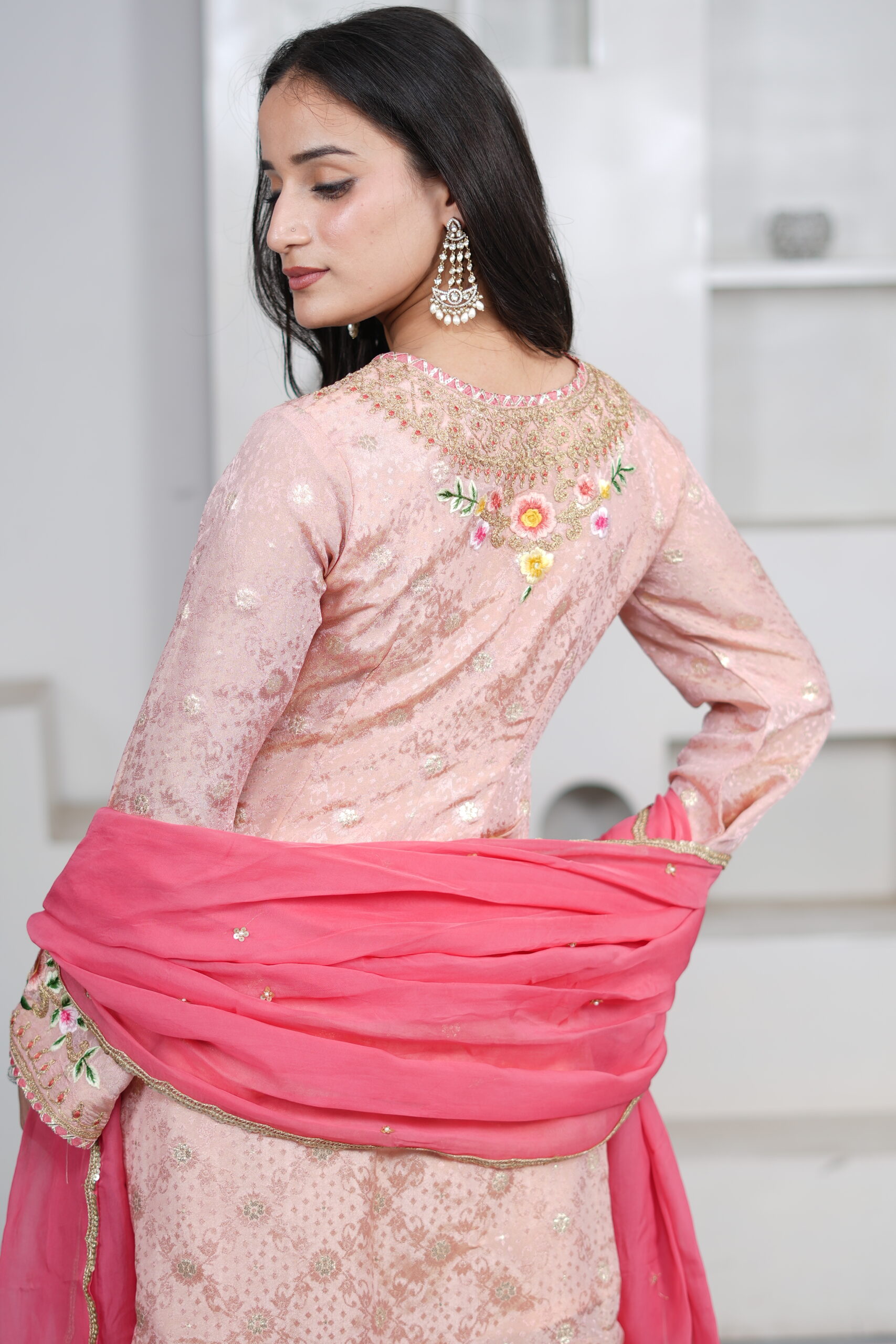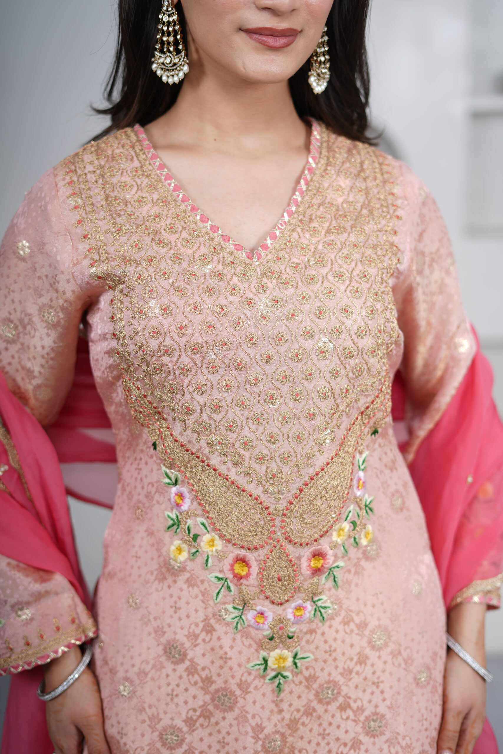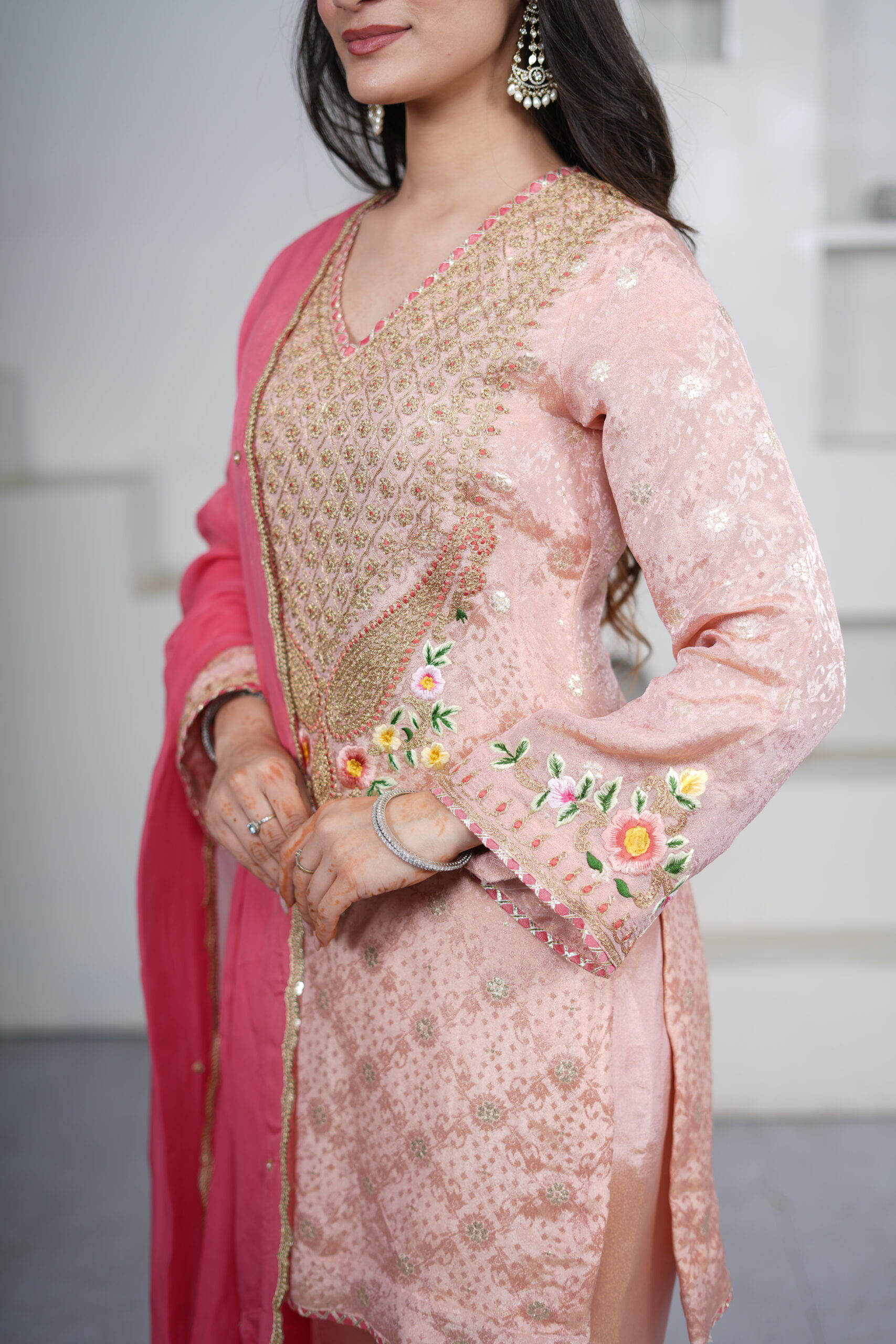 ntroducing our Light Peach Shimmer Silk Short Kurti Set, paired with a flared sharara and an elegant organza dupatta. Crafted in shimmer silk fabric, the kurti features intricate hand dori and resham embroidery, adding a delicate festive charm. The sharara is finished with gota detailing at the hem, while the sheer organza dupatta is adorned with sequin work all over and lace borders, completing the look beautifully for festive gatherings and celebrations.