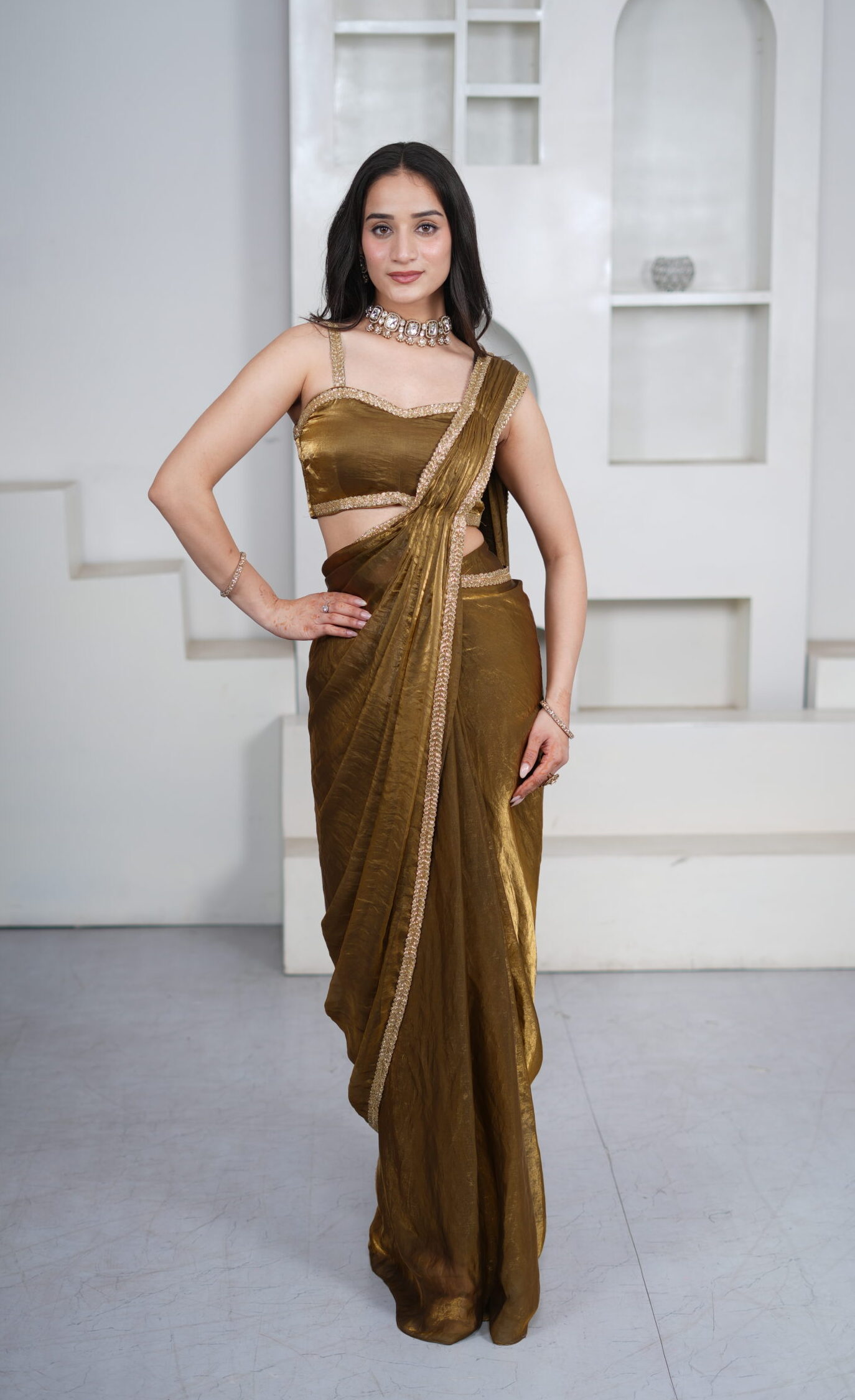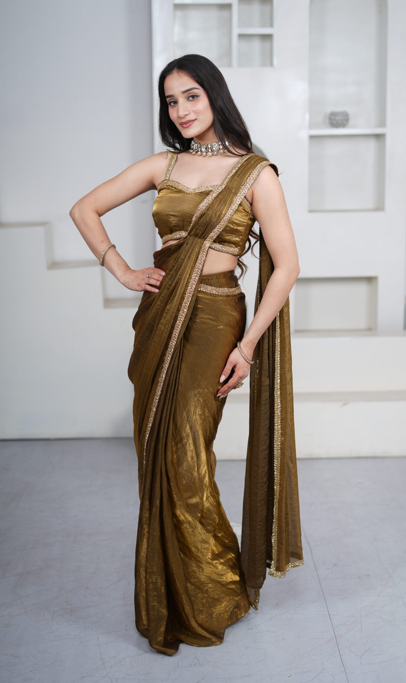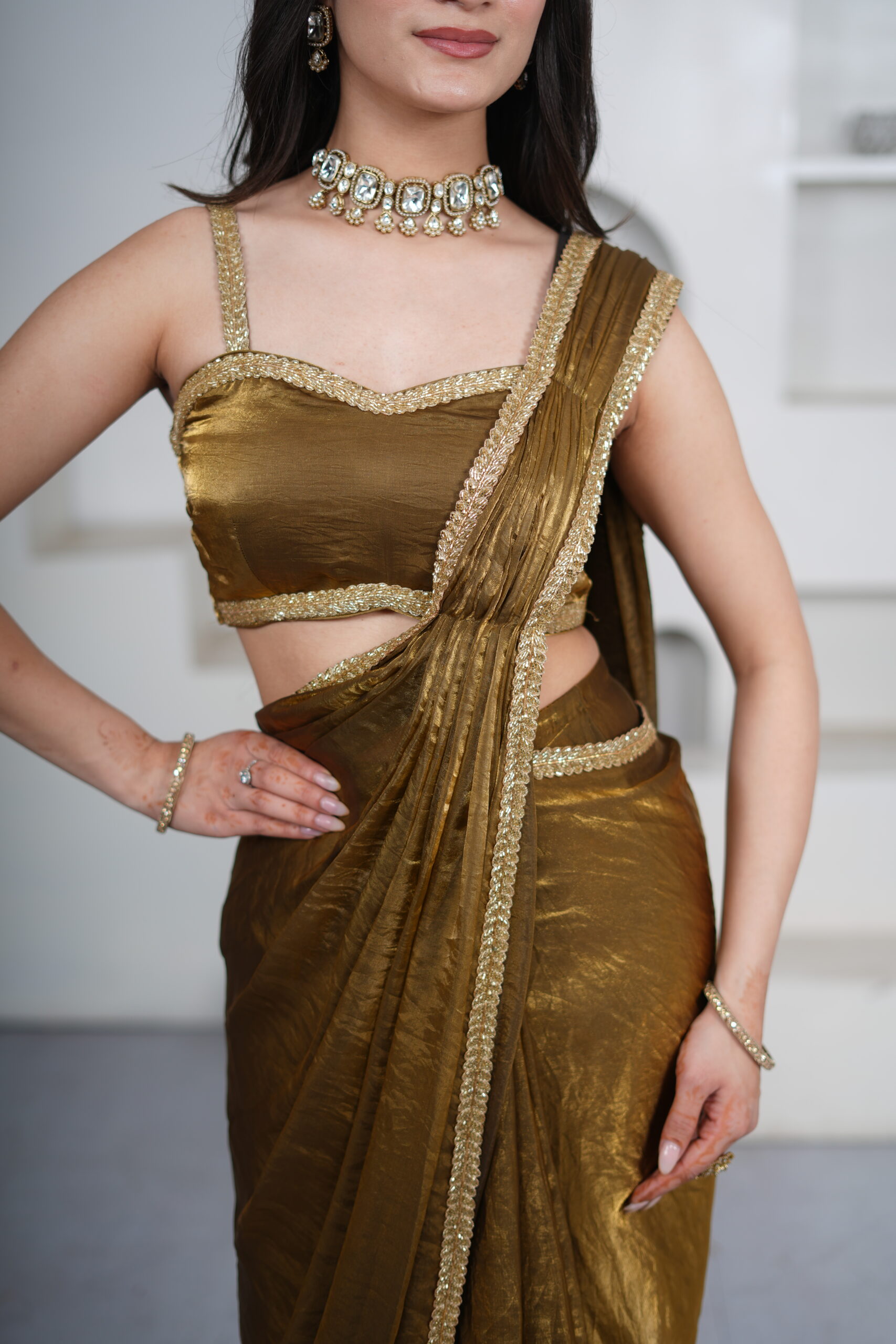 Introducing our Gold Dual Shade Organza Pre-Draped Saree, designed for effortless elegance and modern glamour. Crafted in beautiful shimmer dual-shade organza fabric, the saree features pre-stitched pleats with hooks for easy draping and a graceful fit. The border is adorned with intricate hand embroidery of cut-dana and luxurious nakshi work, adding a rich festive finish.
