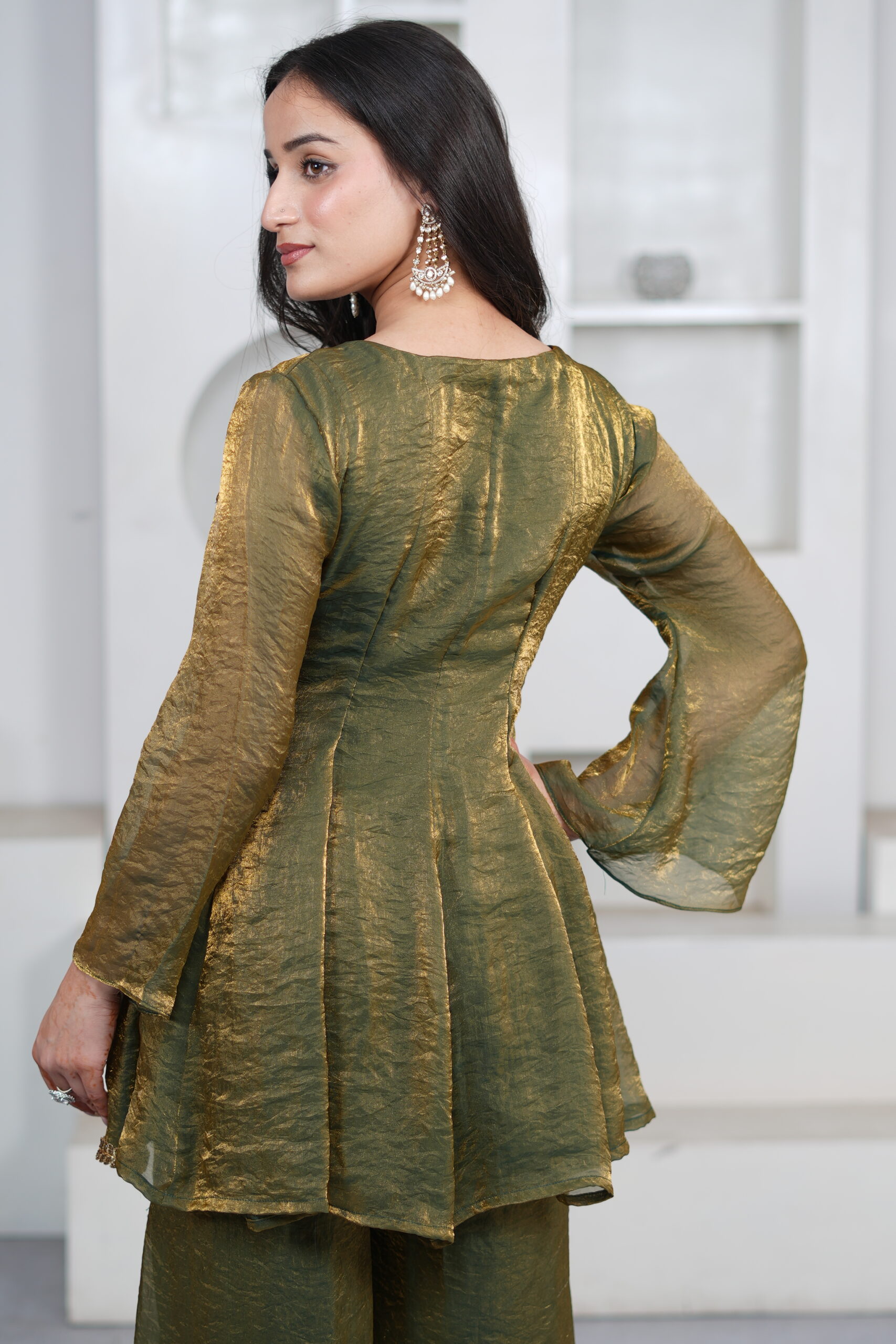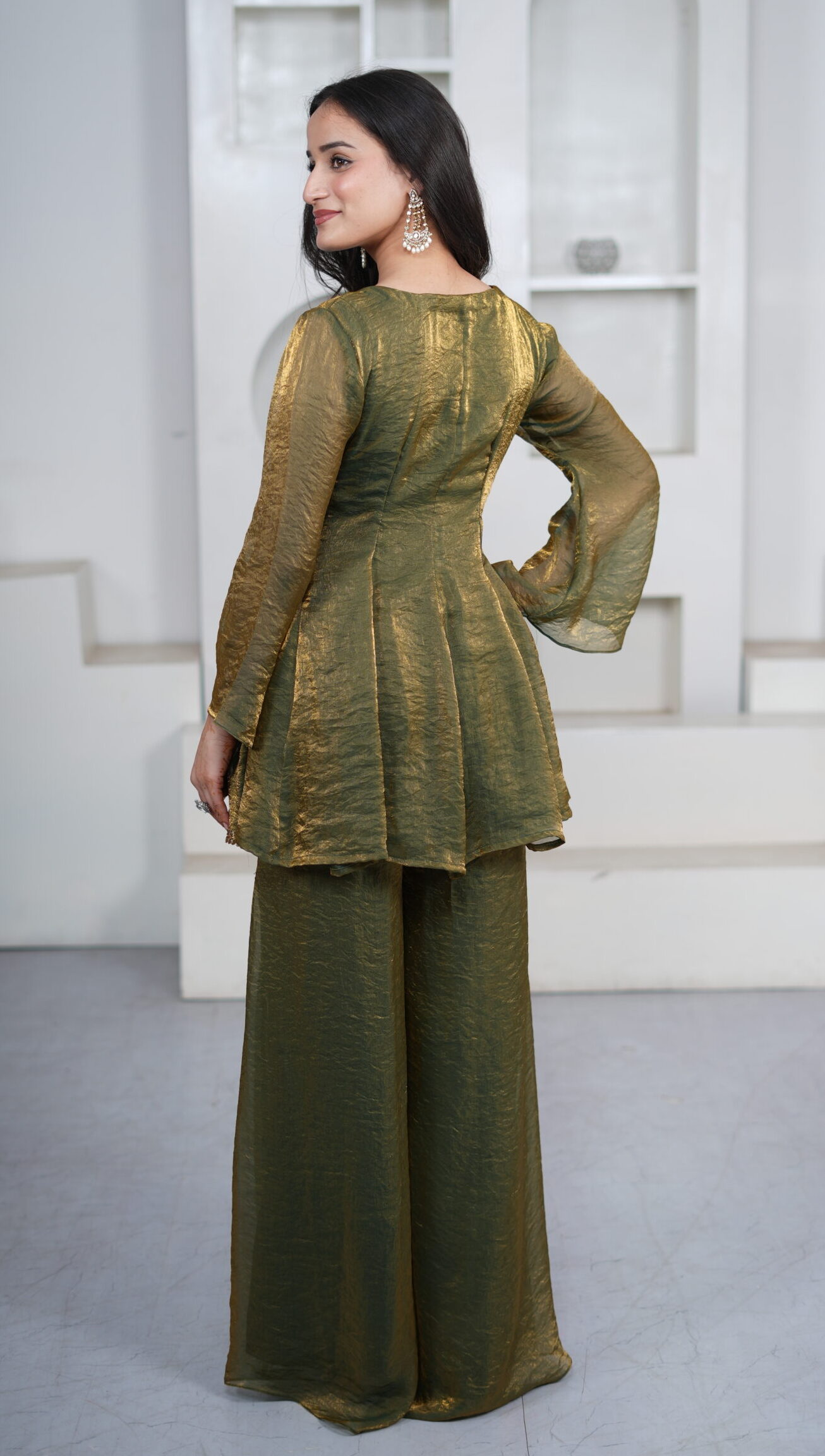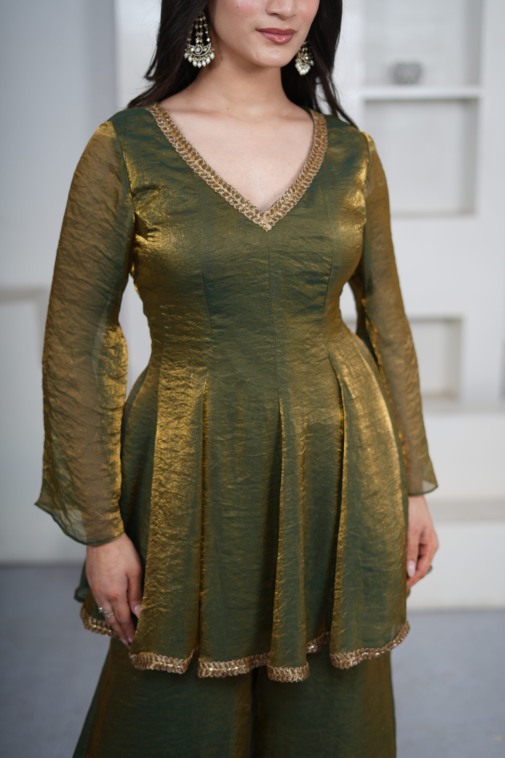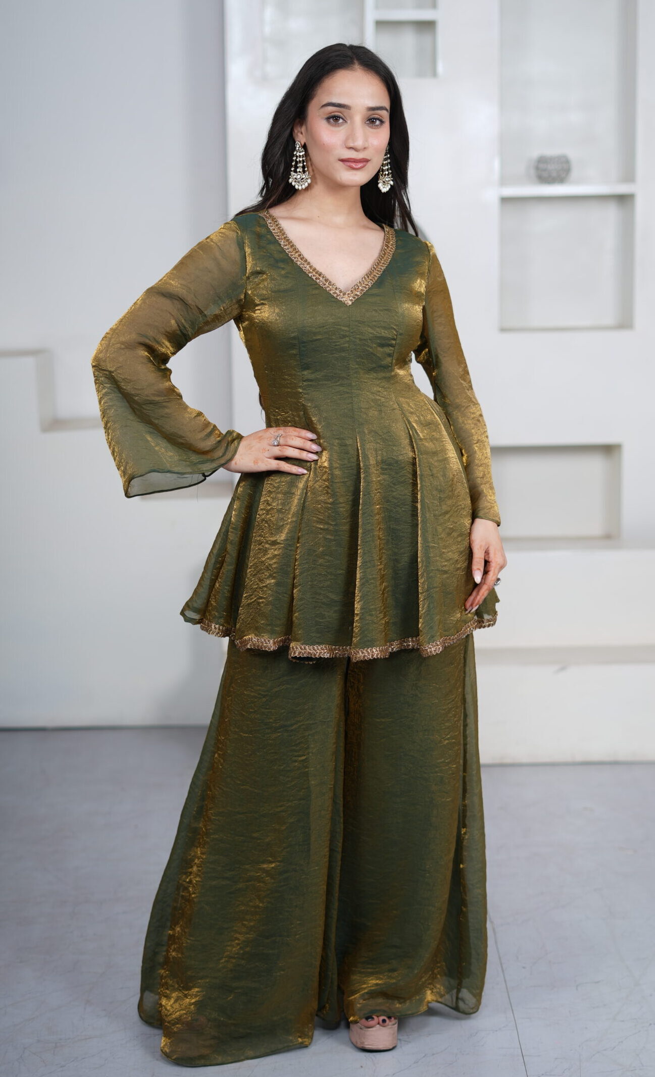 Step into effortless elegance with this lightweight emerald kurti and pant set, crafted in a rich green fabric with subtle golden tones. Simple yet striking, the silhouette is designed for modern women who love understated royalty. Perfect for intimate celebrations, festive gatherings, or stylish evening occasions, this set blends comfort with timeless regal charm.