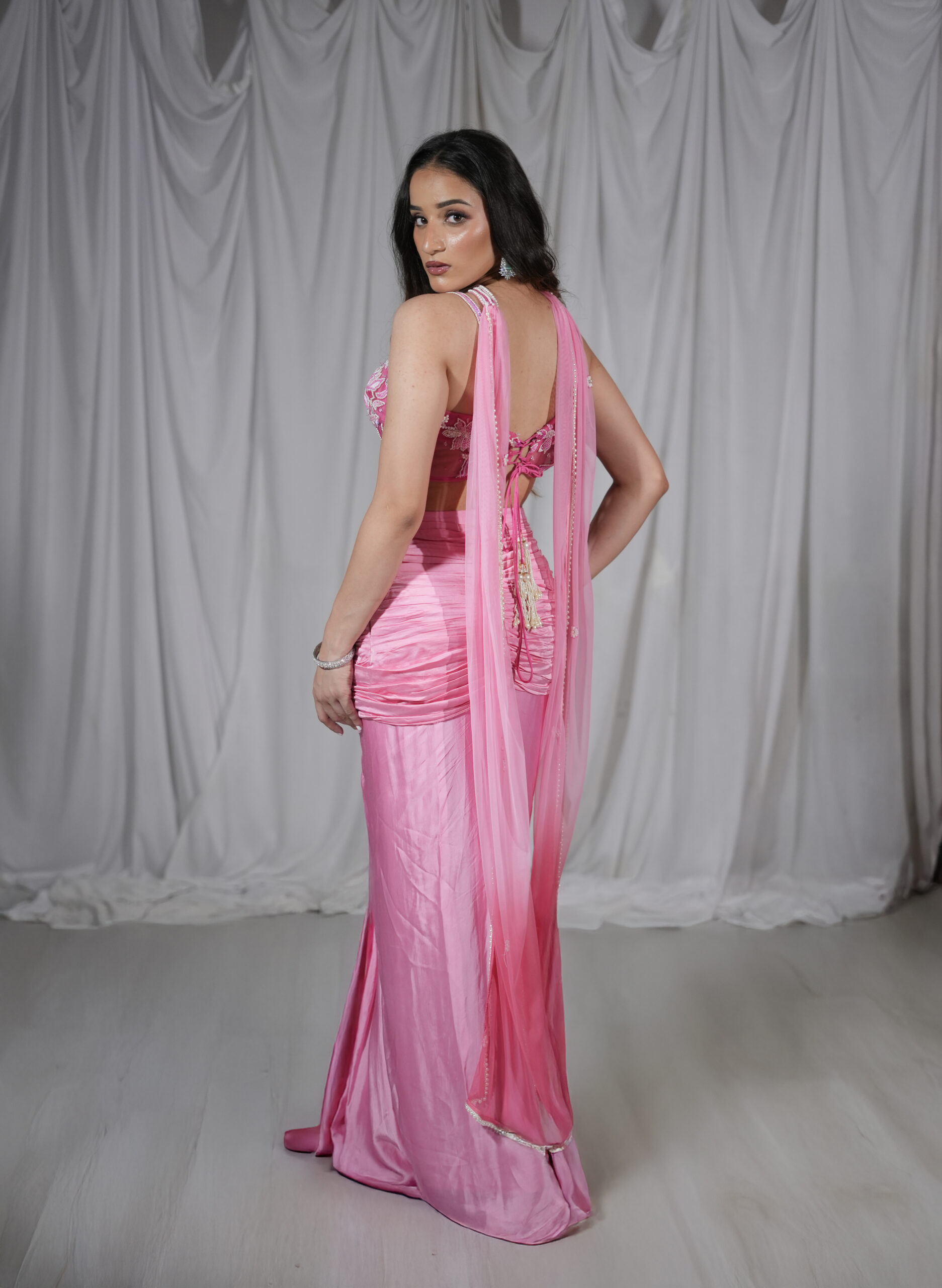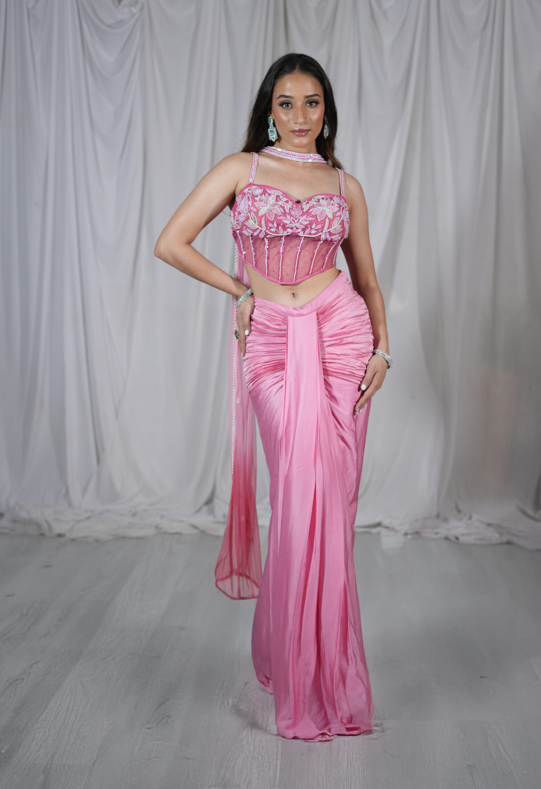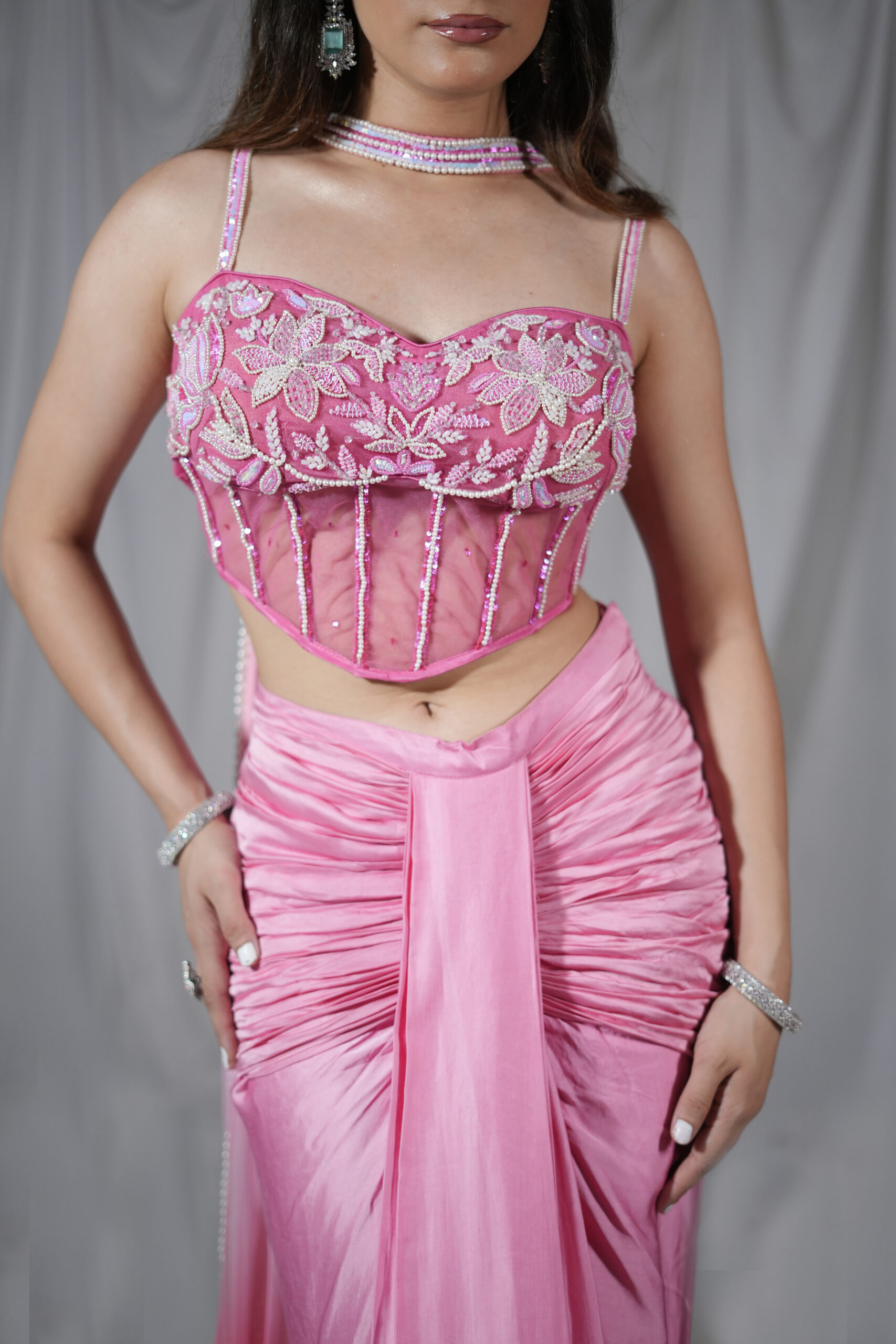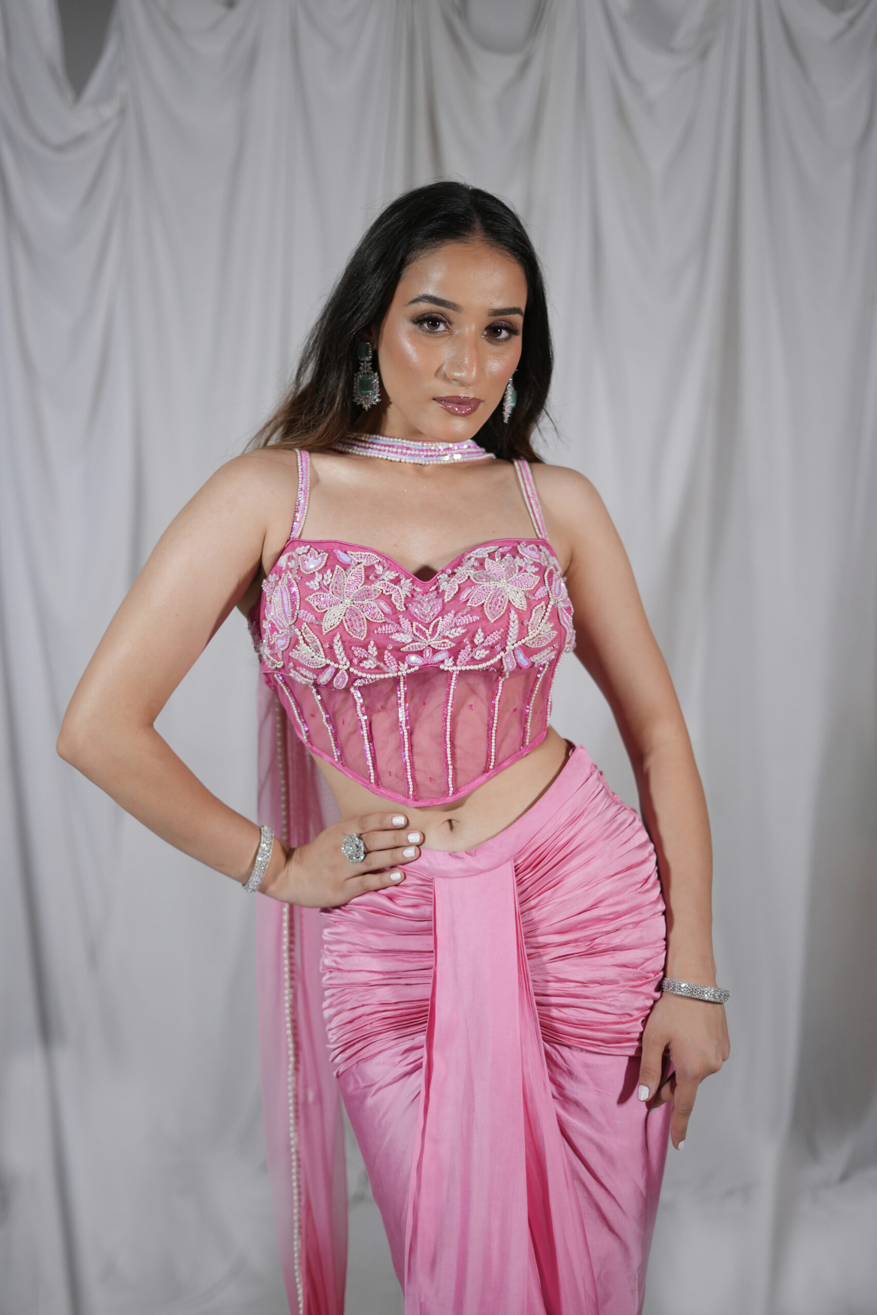 Step into a fairytale dream with this blush-pink corset and draped skirt set, designed to bring soft glamour to life. The fully boned corset is hand-embroidered front and back with intricate pearl, cutdana, and sequin detailing, and features delicate embroidered straps along with a back dori for a beautifully snatched fit. It’s paired with our signature draped dhoti-style skirt, featuring soft gathers on both sides and gentle front pleats, finished with a slightly V-shaped waistband to enhance your curves. The look comes together with our signature necklace-style dupatta, lined with a pearl border and scattered all over with cutdana and sequin butti work. A soft, elegant statement perfect for bridesmaids, festive celebrations, or anyone embracing the magic of modern-day Barbie vibes.