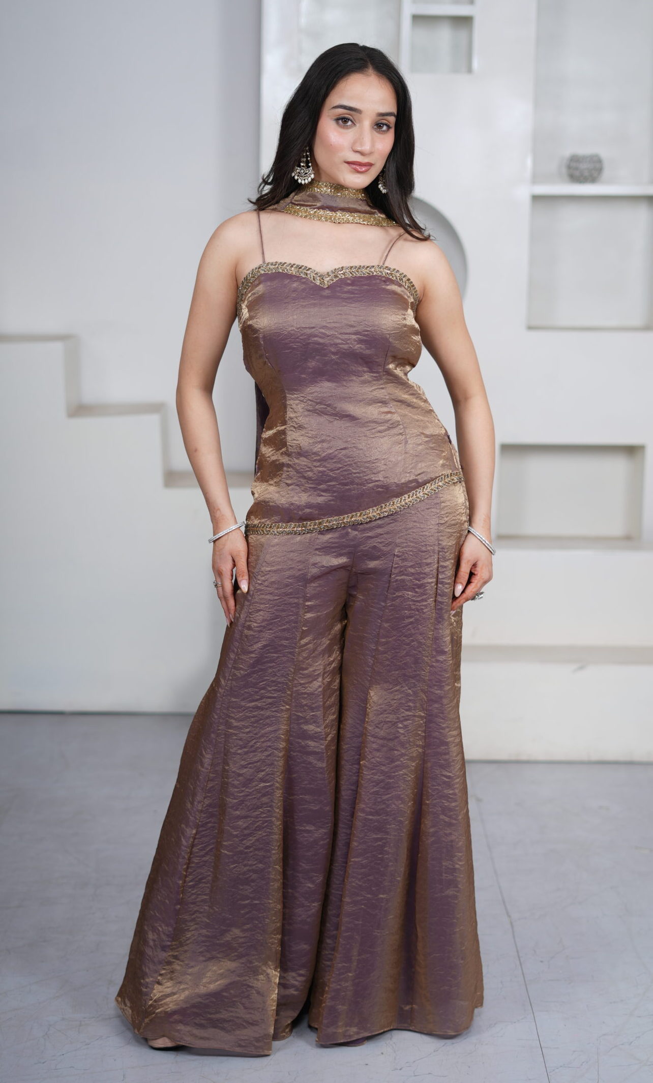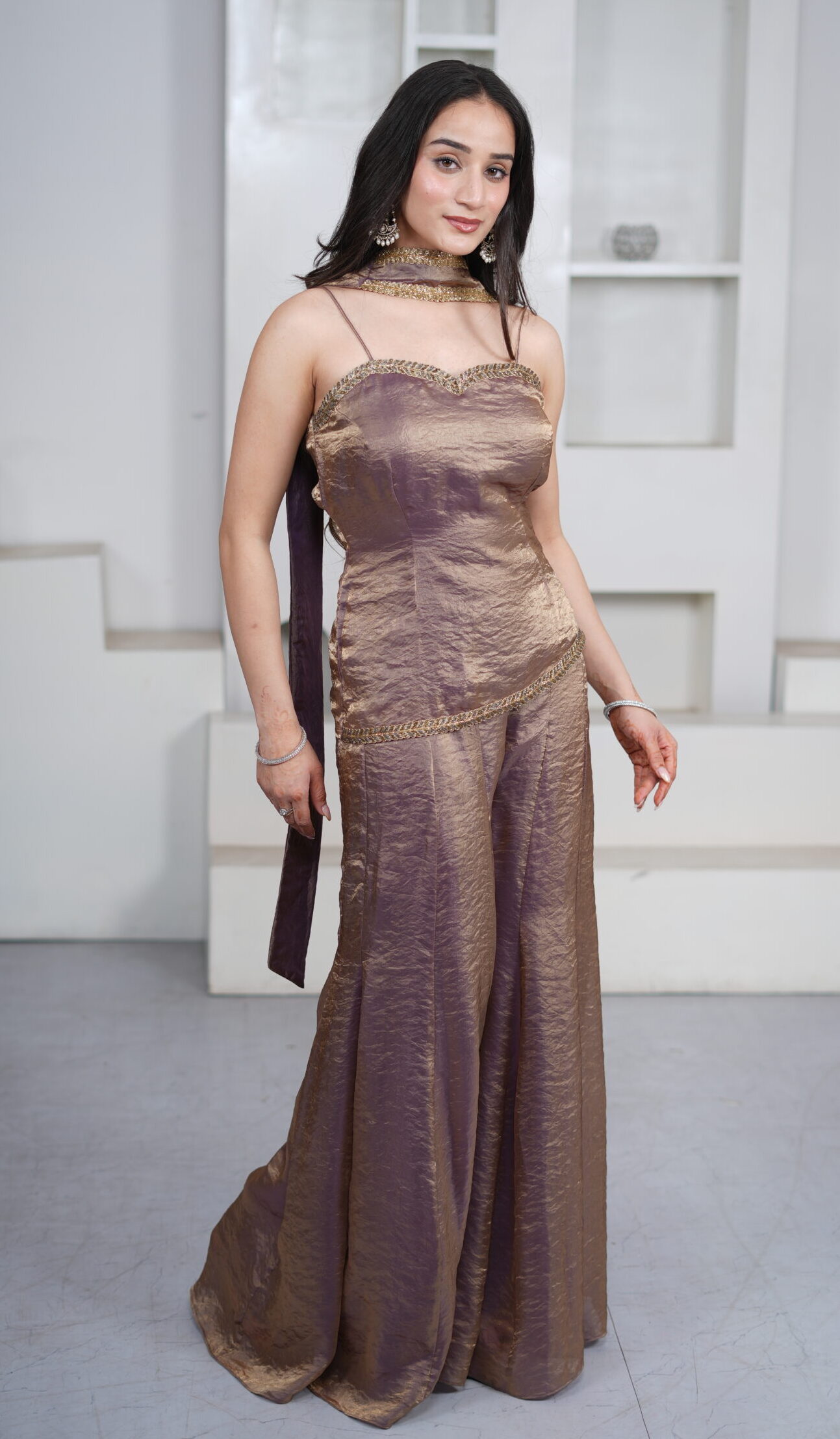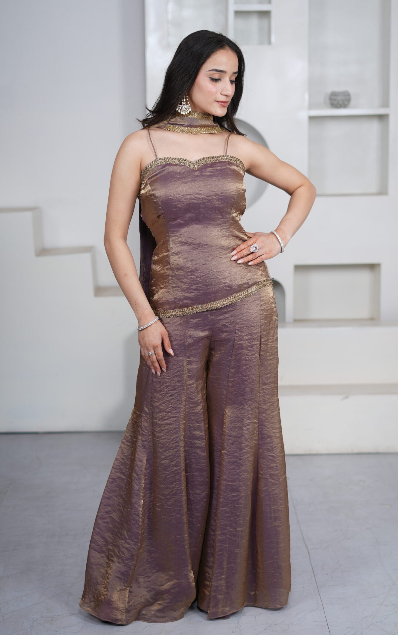 Step into the celebration with the most lightweight yet effortlessly elegant sharara set. Featuring a simple and graceful short kurti paired with a flowing sharara and delicate dupatta, this ensemble is designed for comfort and charm. Perfect for bridesmaids or festive evenings, it blends understated elegance with timeless femininity.